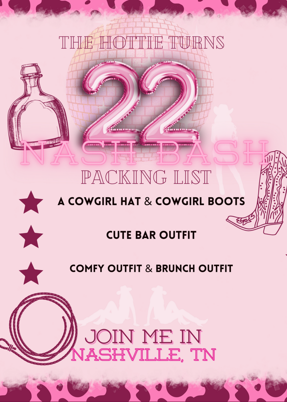 Nash Bash themed Party Invitation, Itinerary, Packing List, and Expense List for Guests
